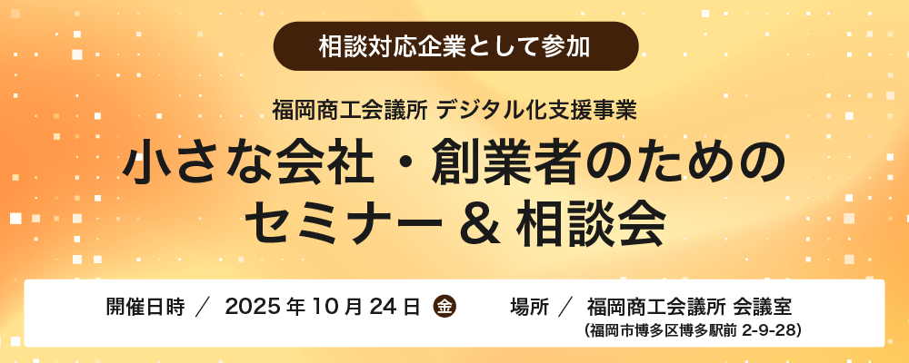 株式会社システムフォレストは、2025年10月24日(金)に福岡商工会議所にて開催されます、福岡商工会議所主催「小さな会社 ・創業者のためのセミナー・相談会」に相談対応企業として参加する事をお知らせいたします。