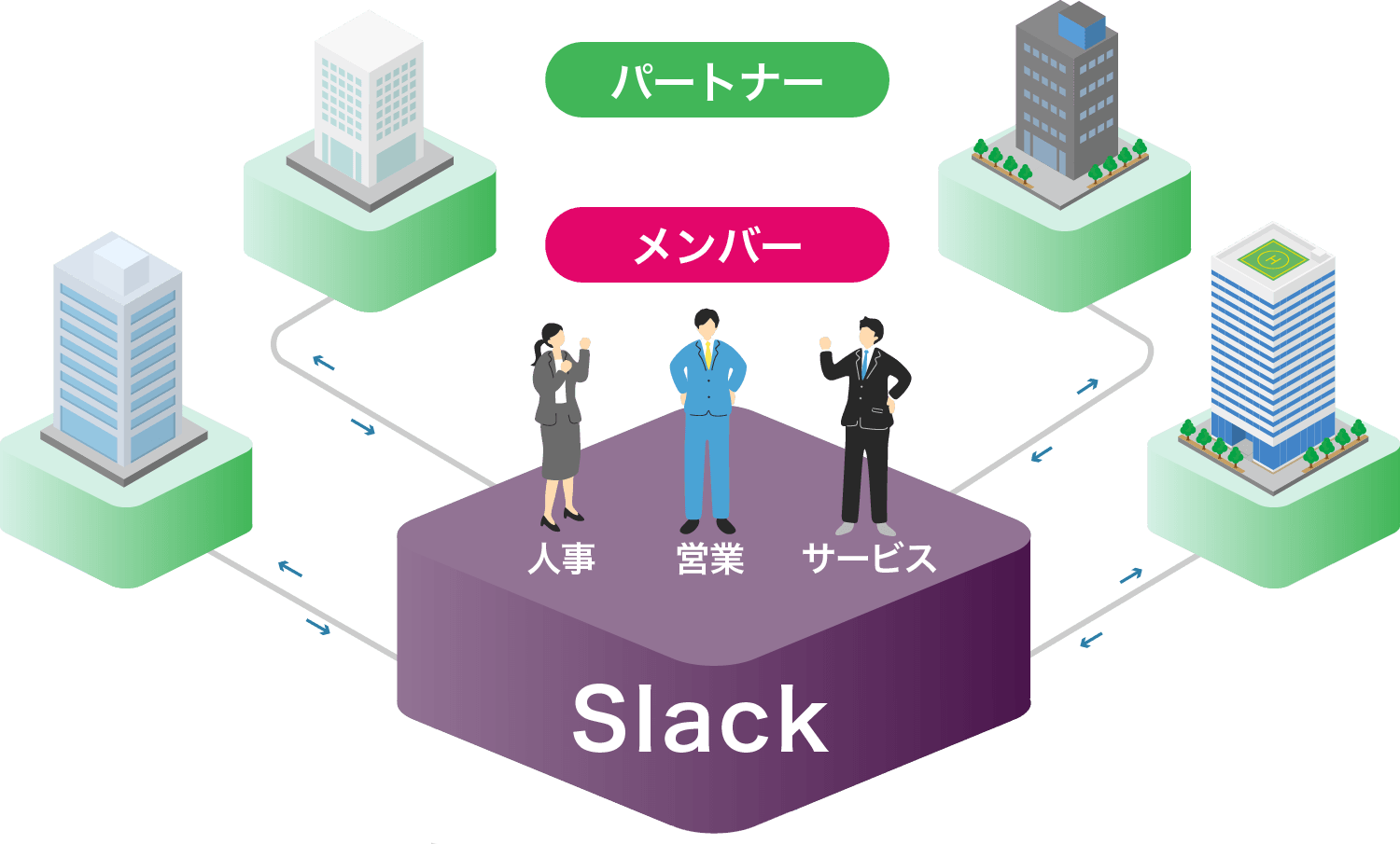 Slackの特長のひとつは、「つながりの幅」が広がること。 部門内で、部門や階層の壁を超えて「つながる」、お客様やパートナー様と「つながる」ことで必要な情報がすぐ届き誰とでもすぐ相談できる、そんな“働きやすい環境”が自然と生まれていきます。